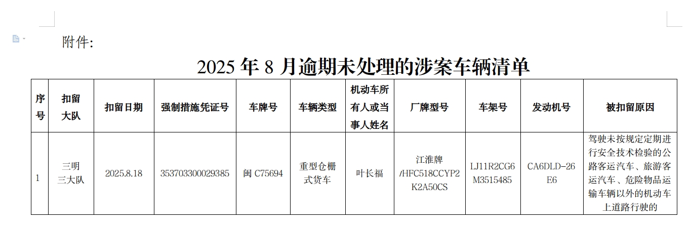 附件:2025年8月份逾期未处理的涉案车辆清单