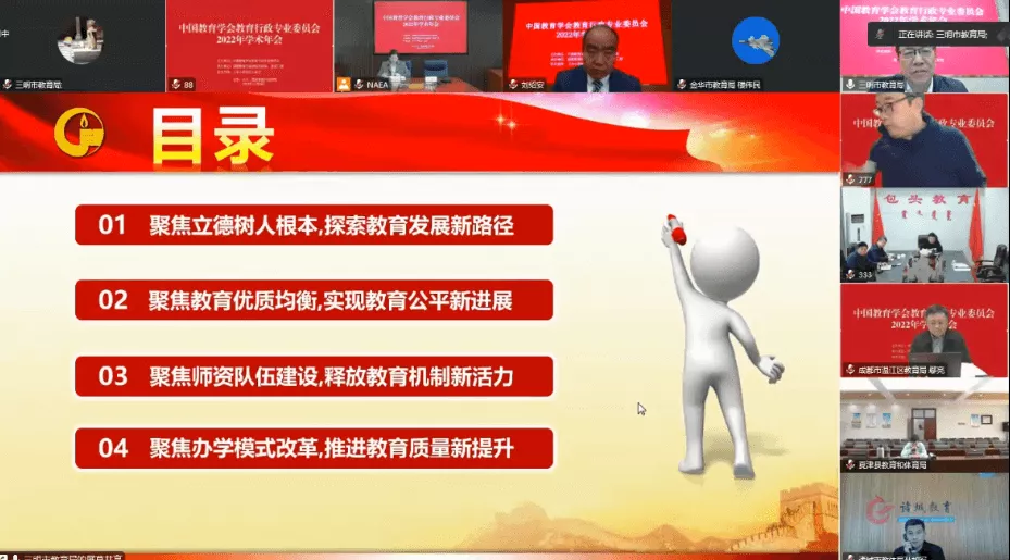 据悉,本次年会旨在深入学习贯彻党的二十大精神,深化教育领域综合改革,推进教育高质量发展,办好人民满意的教育。参加此次线上交流发言的还有教育部基础教育司司长吕玉刚,浙江省金华市教育局党组书记、局长楼伟民,四川省成都市温江区教育局党组书记、局长鄢亮,山东省诸城市教育和体育局党组书记、局长孙加军。