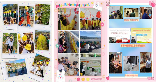 一是总园融合分园的“自然生态教育课程”。在日常教学中融入自然生态教育,不定期组织幼儿到分园实地体验种植园采摘、开展生态广场自主游戏、淮山基地挖掘淮山、田间拾稻穗等活动,亲近大自然,乐享丰收之趣。二是分园渗透总园的“大美育课程”。分园充分利用场地创设空中涂鸦场、生态绘画墙、生态美劳室等艺术创作场所,让幼儿尽情表达对美的感受;挖掘五大领域中蕴含的美育价值对幼儿进行美感培养,促进幼儿全面和谐发展。三是同步开展“合美家教”课程。依托“三明市家风家教示范基地”,两园区在明溪县妇联和县妇女儿童活动中心的指导下践行“合美”家教课程,总园长以省级家庭教育讲师身份专业化指导家教工作,促进两个园区家长家教理念的更新、家教能力的提升,为幼儿园的保教工作质量提升助力。