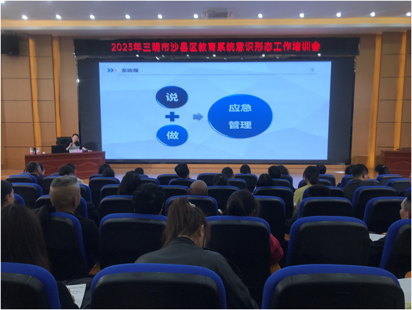 4月7日,沙县区教育系统意识形态工作培训会在金沙二小召开,区教育局党组成员、副局长王宛芳主持会议,各学校(单位)分管宣传(意识形态)校级领导和负责信息宣传(意识形态)负责人和区委宣传部、各乡镇宣传委员共100多人参加培训。