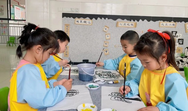 结合艺术分园与高唐二级分园的实际,艺术分园采取“师资共享 特色共建”模式,由一级分园教师定期将“乐艺”墨韵特色课程传送至高唐二级分园。通过活动激发高唐二级分园幼儿对水墨画的兴趣,感受中国经典魅力。