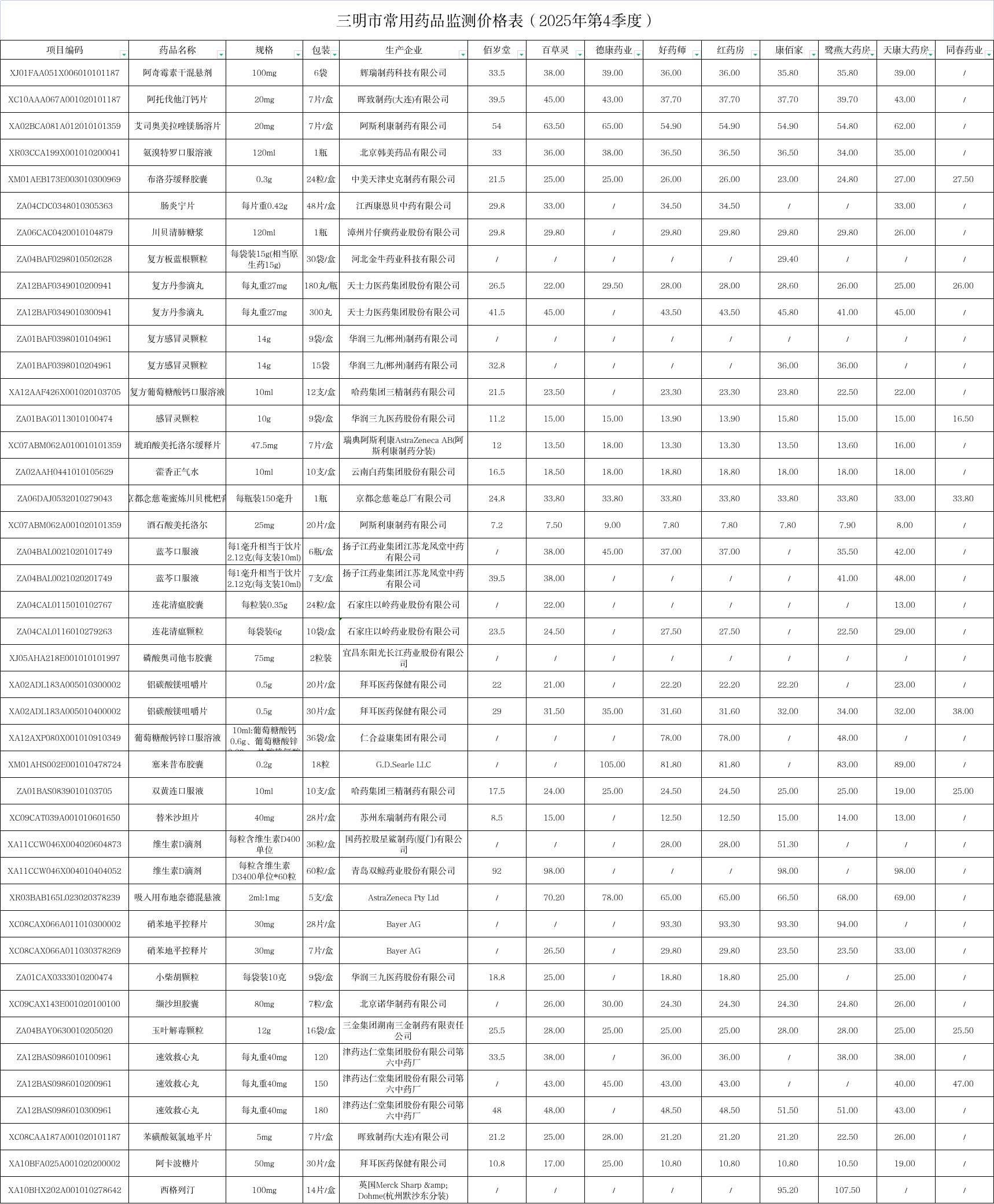 为确保群众能方便比对零售药店常用药品价格信息,按需进行购药,三明市医保局选取具有代表性的零售药店(含连锁)作为常用药品价格监测定点单位,对市场销售量大、社会关注度高、百姓常用的药品价格进行监测。现发布2025年第4季度价格监测信息如下: