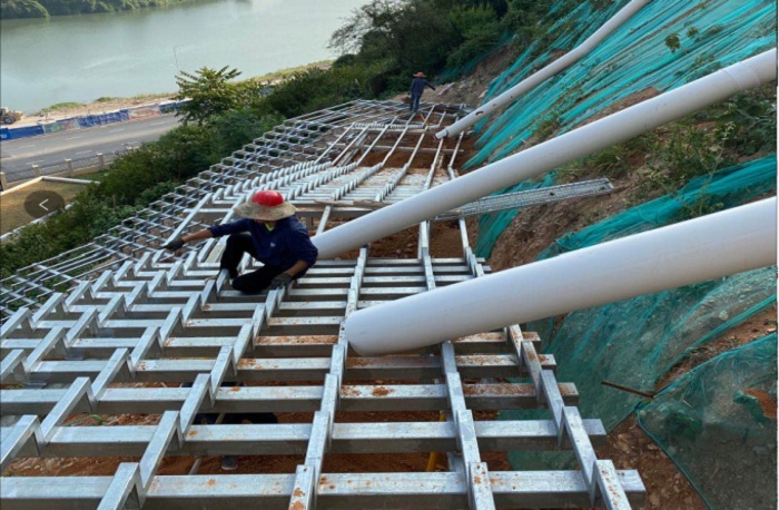 本项目主要为地灾治理工程,原滑坡及崩塌坡面采用削坡、格构梁、锚杆(索)、植草措施防护,坡顶设置截排水沟,坡两侧设置急流槽,坡脚设置挡墙及沉淀池,坡体局部设置仰斜排水孔等。