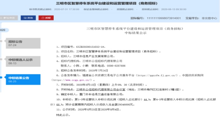 9月2日完成智慧停车平台系统软件开发及维护项目招标工作;三明市区智慧停车系统平台建设和运营管理项目商务标9月4日公示期结束后,与中标人签约,启动市区智慧停车工程建设工作。