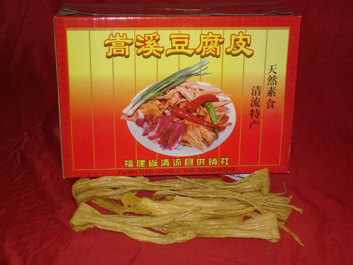 豆腐皮(腐竹)是选上等珍珠黄豆制成,富含植物蛋白,风味独特,是馈赠佐餐之佳品。本品煮、炒、炖皆宜,嫩甜有弹性,口感好,一煮就熟,久煮不糊,色泽黄,略带透明,是天然素食具有清凉滋阴之效。系列产品有:香辣腐竹、美味腐竹、麻辣腐竹及休闲、旅游食品。2001年获福建省农业名特优新产品展销会金奖,在省内的市场占有率达85%。