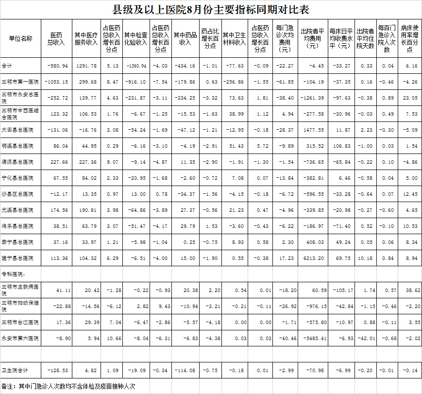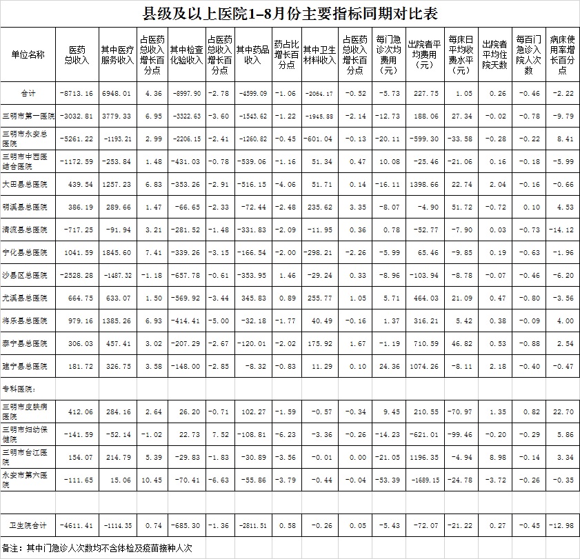 医药总收入。1-8月份12家总医院医药总收入同比下降3.33%(不含体检、疫苗接种和结算差额等收入的医药收入同比下降9.84%),增长率超过考核要求(三级医院考核要求为10%,二级医院考核要求为8%)的有1家总医院,其中将乐县总医院同比增长8.01%。
