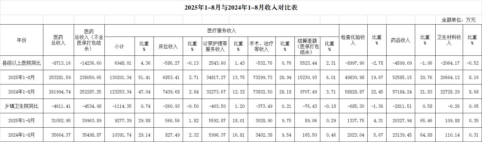 1.医药收入:8月份12家总医院医药总收入30232.72万元,比去年同期30813.66万元,减少580.94万元,下降1.89%。其中:医疗服务性收入15084.51万元,占医药收入49.89%(床位收入914.92万元、手术治疗护理等服务收入13953.54万元、结算差额216.05万元),比去年同期13792.73万元, 医疗服务性收入增加1291.78万元,增长9.37%;药品收入6446.49万元,比去年同期6880.65万元,减少434.16万元,下降6.31%。