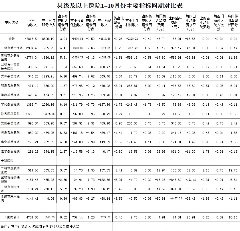 1-10月份基层医疗机构医药总收入38612.84万元(其中村所收入4799.01万元),去年同期43319.89万元,同比减少4707.05万元,下降10.87%,其中:医疗服务收入11480.85万元,占医药收入29.73%(床位收入691.54万元、手术治疗护理等服务收入10789.31万元,结算差额85.93万元),去年同期12525.70万元, 医疗服务收入同比减少1044.85万元,下降8.34%;检查化验收入1595.14万元,同比下降31.61%;药品收入25403.39万元,去年同期28325.70万元,同比减少2922.31万元,下降10.32%,药占比65.79%,去年同期65.39%,同比增长0.40个百分点;卫生材料收入133.46万元,较去年同期136.22万元,同比减少2.76万元,占医药收入0.35%,较去年同期0.31%,同比增长0.03个百分点。入院人次39862人次,去年同期58513人次,同比减少18651人次,下降31.87%,其中明溪县、泰宁县、宁化县分别下降63.05%、51.11%、46.50%;门急诊人次5105770人次(其中村所诊疗1662771人次),去年同期5103351人次,同比增加2419人次,增长0.05%(基层诊疗量占比为47.30%,较去年同期的47.45%减少0.15个百分点);每门诊次均费用68.39元,去年同期73.31元,同比减少4.91元,下降6.70%;出院者平均费用903.19元,去年同期978.00元,同比减少74.81元,下降7.65%。
