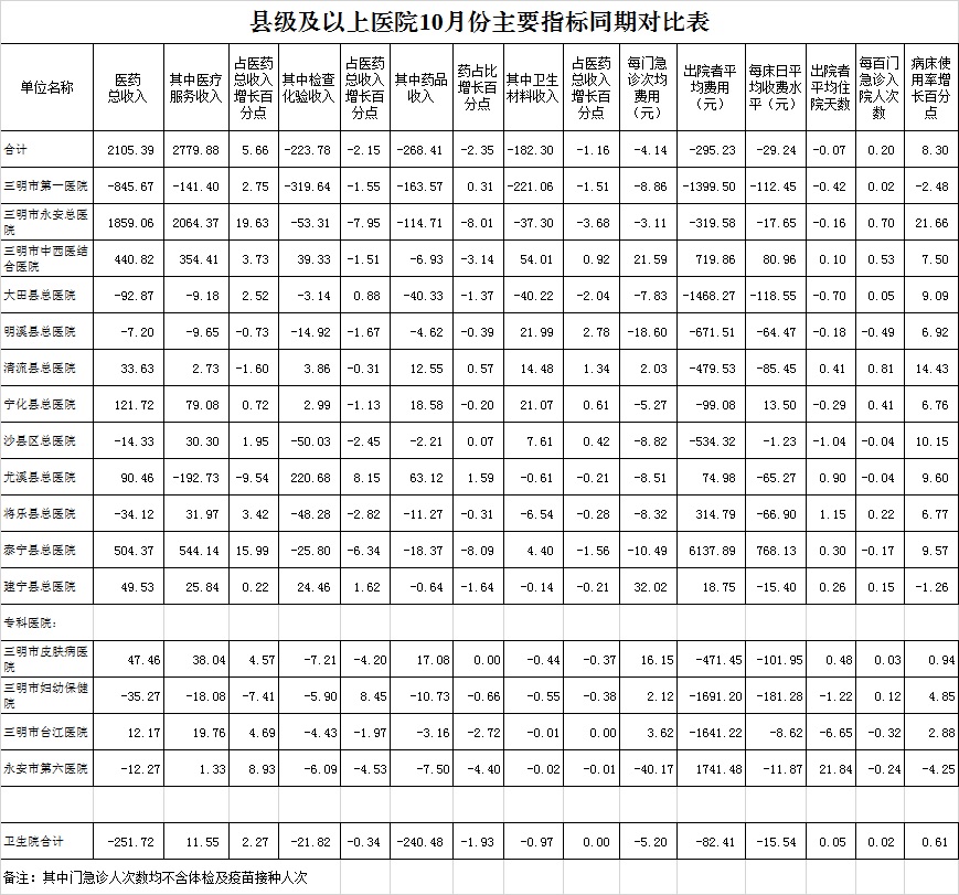 医疗服务收入占比。1-10月份12家总医院医疗服务收入占医药总收入51.39%,其中:市第一医院47.10%、三明市永安总医院50.68%、市中西医结合医院54.09%、大田县总医院57.11%、明溪县总医院51.43%、清流县总医院53.64%、宁化县总医院57.59%、沙县总医院50.26%、尤溪县总医院49.58%、将乐县总医院54.37%、泰宁县总医院57.81%、建宁县总医院53.02%,所有总医院均完成了考核指标。