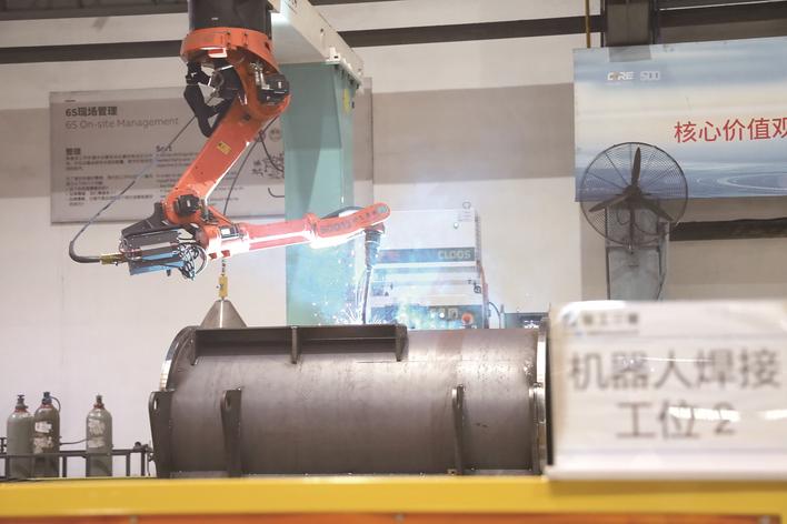 厦工(三明)重型机器有限公司车间内的焊接机器人正精准焊接机座筒体。