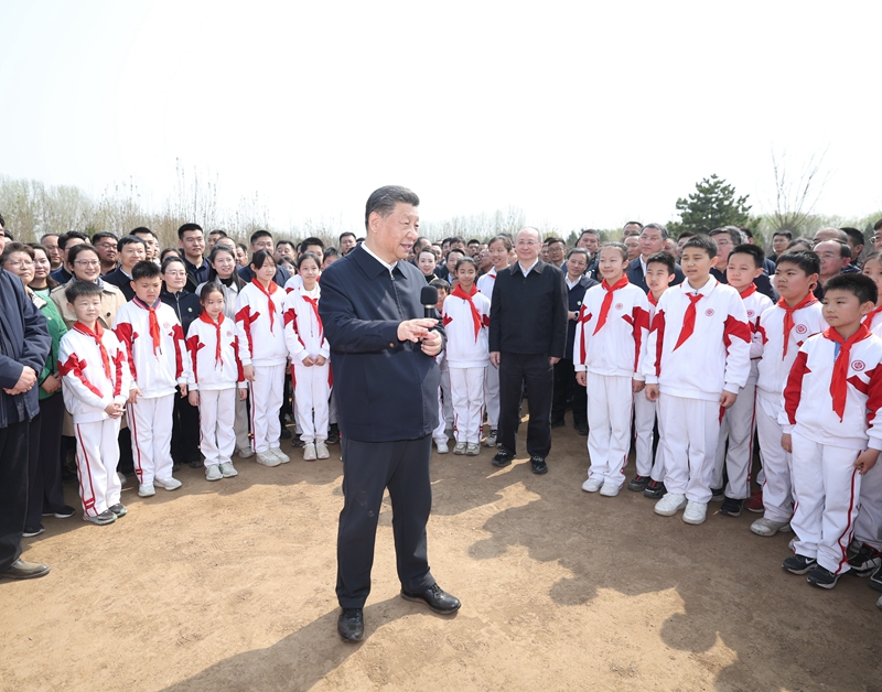 4月3日,党和国家领导人习近平、李强、赵乐际、王沪宁、蔡奇、丁薛祥、李希、韩正等来到北京市通州区潞城镇参加首都义务植树活动。这是习近平同少先队员在一起。新华社记者 李学仁 摄